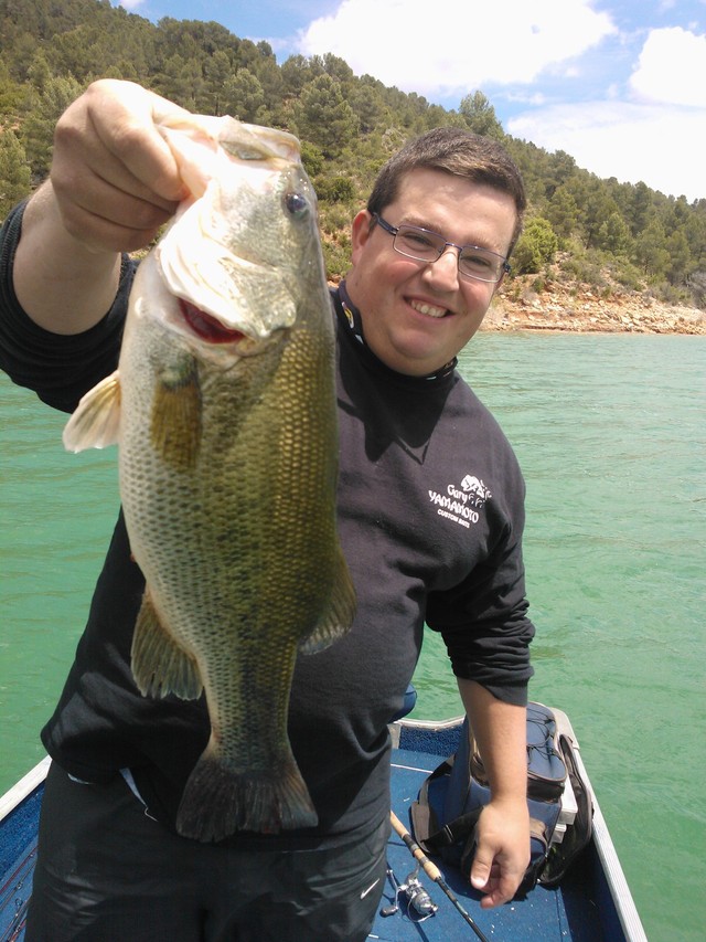 Estabamos pescando en la maraña cuando de repente Emilio tiene una buena picada, y empieza a gritar «Salabre, salabre», un buen bass peleaba entre los matorrales sumergidos. Finalmente, Emilio tiró de maestría para subirlo al barco. Un buen bass que Emilio pesó a ojímetro en 2.3kg.