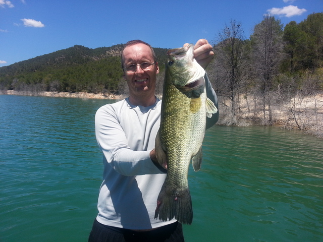 Llegados al punto P a la hora H empezamos a batir agua y el primero en subir un bass al barco fue Andrés con su Rapala DT10. Como siempre su aprensión para coger al bass de la mandíbula le hace poner caras.