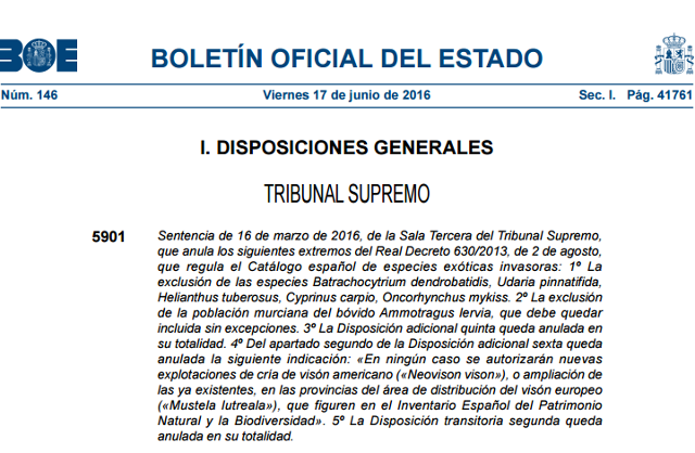 Hoy es un día triste para nuestra afición ya que se ha publicado en el BOE la sentencia 637/2016, en la que estimaba parcialmente el recurso contencioso-administrativo interpuesto por las entidades CODA-Ecologistas en Acción, Sociedad Española de Ornitología (SEO/BirdLife) y la Asociación para el Estudio y Mejora de los Salmónidos (AEMS-Ríos con Vida) contra el Real Decreto 630/2013, de 2 de agosto, por el que se regula el Catálogo Español de Especies Exóticas Invasoras. Las modificaciones que implica esta sentencia en la Ley 42/2007 supone que se prohíbe la posesión, tenencia, transporte, comercialización, etc. de ciertas especies que están dentro del catálogo, como es el Black Bass.